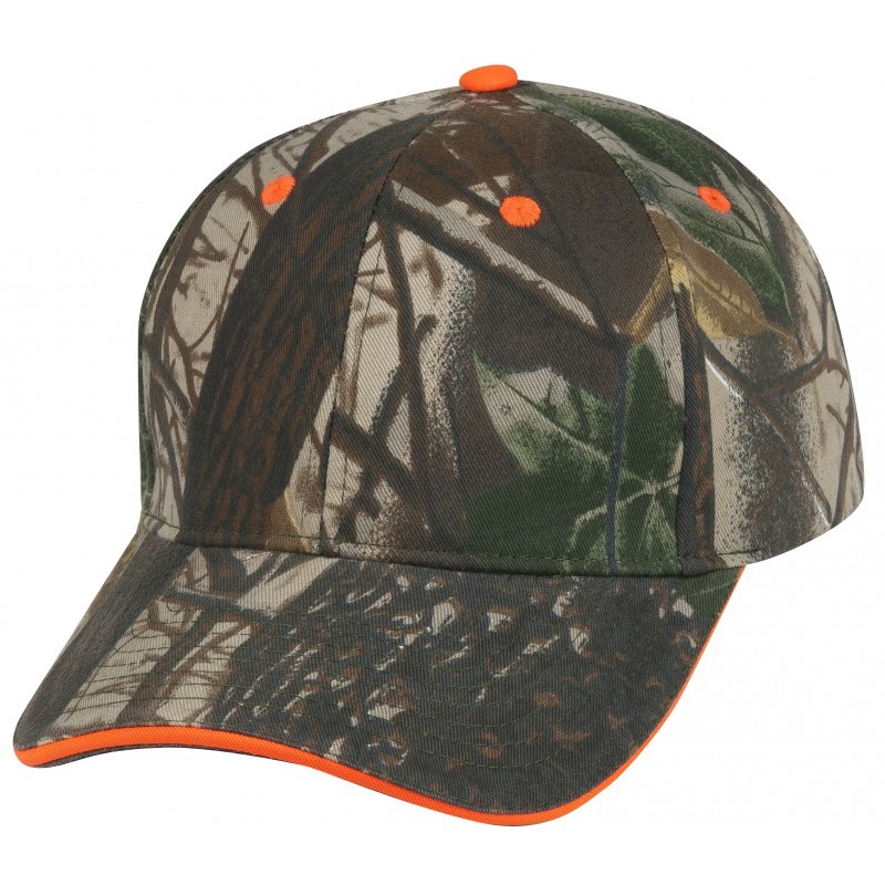 Camo visor and crown, Flame orange sandwich bill, eyelets, and top button