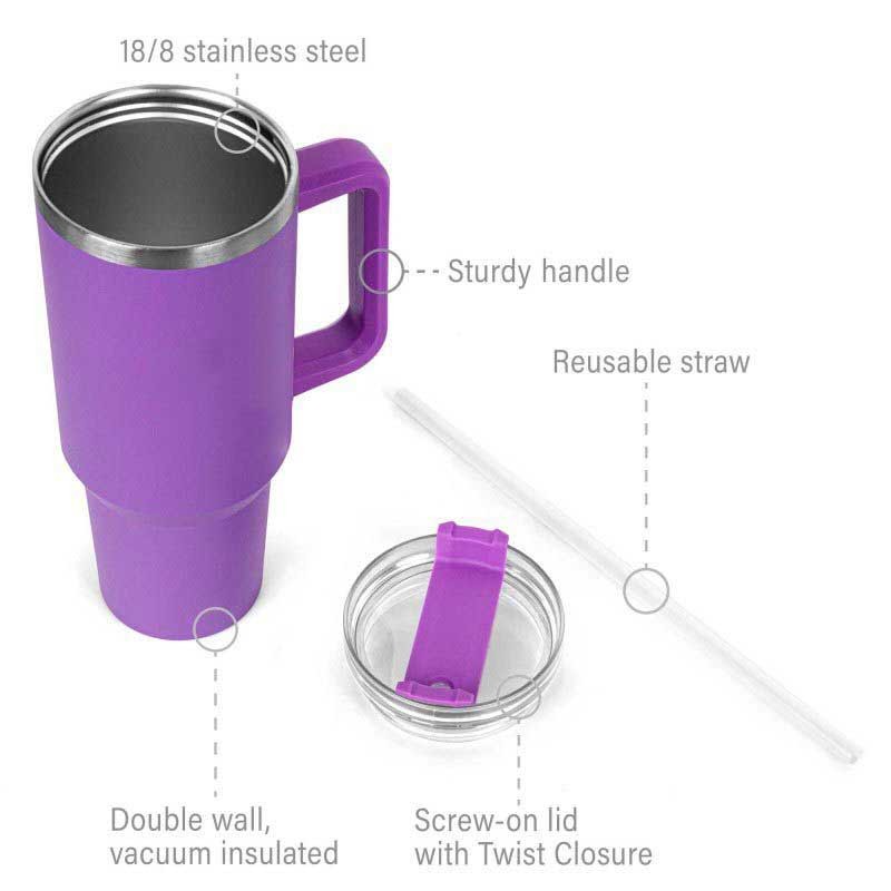 Each mug is strong and durable, from its handle to a convenient screw-on clear straw lid with a twist closure, giving you the option of drinking with or without the removable straw