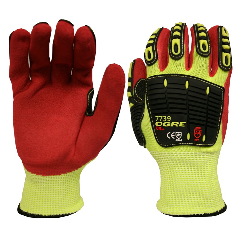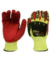 These gloves are designed for those down and dirty jobs that require gripping power and impact protection. It features a 13-gauge, hi-vis, high-performance polyethylene (HPPE)/glass fiber shell, thermoplastic rubber (TPR) protectors for impact resistance, and a reinforced thumb crotch for increased durability. It also provides interior foam palm padding for better comfort and a red, sandy nitrile coating.